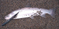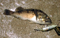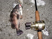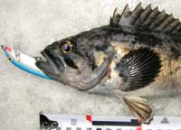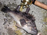 海アメ釣りにまたまた江ノ島に行って来ました。2/7〜2/8波が無くベタ凪!!ショック!! 厳しい釣りになるなぁーと思いつつスタートフィッシング。 ルアーをキャストしていると「ゴン」とバイト!? でもいつもと違うバイトの出かた… やっぱりなーと思いつつルアーアクションをチェンジ! またまたゴン!とバイトがありフッキングしたけど痛恨のバラし! 思ったより手強いナァと再びキャストを繰り返し何とかキャッチできました。 62cmの元気な海アメ プレッシャーが高くルアーが見切られやすい状況。 しかもバイトはショートバイトのみ! よく釣れたものだなぁ〜と自分でも信じられないくらいでした。 結局バイトはたくさんあったけれど巧くアワせる事が出来ずに2匹のみの釣果でした。 2/8気合を入れて朝あら夕方までずーっとキャストし続けたけれど、1匹釣れただけでした。ベタ凪のせいで小型の海アメが多く、バイトはたくさんあったけど…。 120oのミノーで30cmの海アメを釣るのは難しかったです。釣れたのは約50cmの海アメ1匹だけでした。 ロッド:ウエダ プラッキングスペシャル10ft リール:シマノ アルテグラ3000DH ライン:デュエル X−TEXオーシャン12lb |