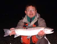 2/19 またまた島牧に海アメ釣りに行ってきました。 朝からずーーーっとキャストし続けるけどバイトすら無い。 ベタ凪なんだけど…。 きぬ君がオリジナルアワビ張ジグで1匹釣っただけで他4名(僕も含め)BZ…(涙) ![]() 少し昼寝して午後の部スタート。 ポイントを色々とランガンしていくけどバイト&チェイス無し…(涙) 釣れる筈と信じて自分の一番信用しているルアーをキャストし続けると! 「ガツン!!」とバイト フッキングし思いっきりロッドをあおる。 しかし微動だにせず走り出す…。 デカイのがかかった〜 と慎重にやりとりし何とかキャッチできました。 ![]() 70.5cmの立派な海アメでした。 久々の70UP!自分でも良く釣れたなぁ〜と感心してしまいました。 写真撮影後、元気に海に帰ってゆきました。 ロッド:ウエダ CPS-102Ti リール:シマノ アルテグラ3000DH ライン:デュエル X−TEX オーシャン12lb |