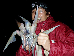 コメント: この技は大変手が真っ黒になるので良い子は真似しないでネッ!! 釣り人:北さん イカ:ヤリイカ 場所:小樽港 日時:2004/5/18 20:30〜22:30 エギ:ヤマシタ エギスッテFS(限定エギ)