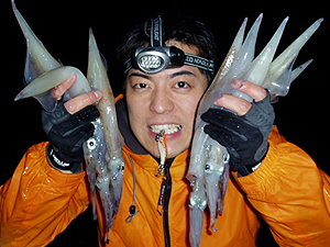 コメント: はじめはきちんと15カウント。 そしてトゥイッチ&ジャークで釣れました。 その後はなぁ〜んか適当にビシバシやってりゃ釣れました♪ 釣り人:竹さん イカ:ヤリイカ 場所:小樽港 日時:2004/5/18 20:30〜22:30 エギ:ヤマシタ エギ王 光宮