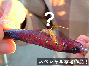 コメント: ボトム付近で・・根に潜られるかと思った(爆) 釣り人:ノゾミさん イカ:?イカ 場所:小樽港 日時:2004/5/18 18:30 エギ:やばい・・エギじゃないや・・・ 管理人より:ヒットしたのはワーム(笑)衝撃的映像につき、参考作品として展示させていただきました♪