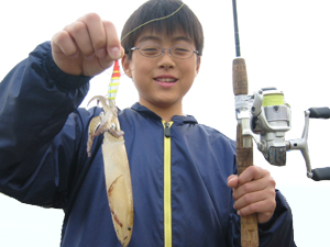 コメント:「初の海釣りでヒット!お父さんはタックルを忘れて絶不調」 釣り人:ジェリーくん(父はトム) イカ:豆イカ 場所:小樽港 日時:2004年 6月26日 PM6:08 エギ:ヤマシタ エギスッテFS