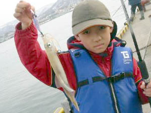 コメント:ついてる?ついてない?やっぱりついてる!! 釣り人:A・Fジュニアさん 場所:小樽港 うまや岸壁 日時:H17 4/30 ルアー:マルキュー フィッシュリーグ エギリー2.5号(ピンクウイングマーブル)