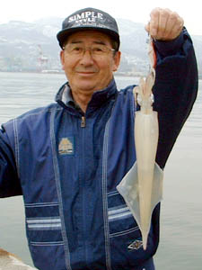 コメント:1回目はエサ釣りで×。2回目こそヤリイカヒットだ!とエギで待望のヒット!!エギングもっと頑張ろうっと。 釣り人:Kパパさん 場所:小樽港 北防波堤 日時:H17 4/28 PM3:00 ルアー:ヤマシタ エギスッテ 2.0号 オレンジ