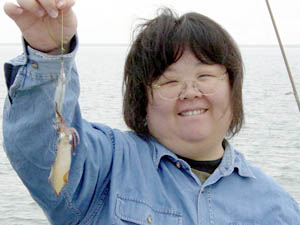コメント:釣った人はデカイですが、獲物は小さかったですw 釣り人:ますみさん 場所:岩内 日時:H17 6/23 ルアー:ヤマシタ エギ王Qイワシカラー