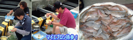 | 裏話@ …ここで裏話を一つ。 前回のハゼ釣り大会は参加者の釣ったハゼ、事前に頂いた野菜等をその場でさばいてからのハゼ丼でした。 ここからが、虐待ハゼ丼大会に早変わりの瞬間だったのです。 PAPA軍団の皆さんは半ば強制的にハゼ丼製作に狩り出されました。 特別巧みなkomaさん、おかっちさんを先生に、男性陣必死のハゼ解体作業。 小さいハゼをさばく手間に疲れきっていた身体に追い討ちをかけるよう炎天下の中、 熱気ムンムンの天ぷら揚げを行ったのでした。 しかも、最悪な事に。 こんなに頑張ったPAPA軍団、ハゼ丼を食べるの一番最後。 …このような過ちを二度と繰り返す事の無いように対策を練った管理人。 今度のハゼ丼は一味違うぜと練り出した秘策というのが。 ハゼ200匹 PAPA軍団の皆さんに 前日釣ってきてもらおうかな。なーんて。 でも、大会当日釣れなくなったら困るから。 「100mくらい遠投して誰も狙ってない場所の特に大型ハゼを」 ※PAPA軍団にぜひ入れて下さいとおっしゃってた奇特な数名の方、後悔先に立たずです。 やはり、苦労させている事実は変わり無く。 お礼はコーヒーのみ?なーんて…。T氏、はんださん、かしさん、、じんさん、まちゃ、料理係ATXさん。 心よりお礼申し上げます。