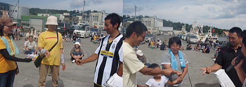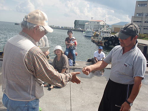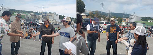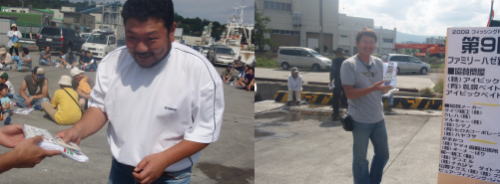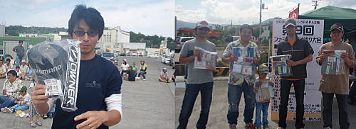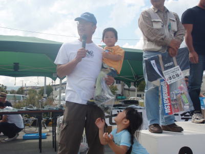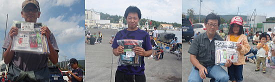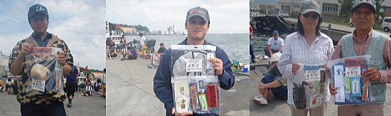 ジュニアの部の次は、大人の部(高校生以上)の発表となります。 ![]() それでは、第1位の発表です。 第1位、41匹の釣果!! 小澤真人さん!どうぞ、前にお越し下さい! ※昨年も堂々の第1位。 ![]() 第2位は、21匹でお二人おります。 安藤修次さん、小澤吉則さん前の方にお越し下さい。 それでは、はい、最初はグー、ジャンケン・・・・、 ポン! ![]() 結果、 第2位は、安藤修次さん。 ![]() 第3位は、小澤吉則さん。 ![]() 第4位は、杉森秀俊さん。 ![]() 第5位は、黒田威嗣さん。 ![]() それでは、早速、ヒーローインタビュー! ![]() 【第1位の小澤真人さんのコメント】 北浜岸壁での釣果です。3本で遠投で狙ってました。 ![]() 【第2位の安藤修次さんのコメント】 北浜岸壁でやってましたが、苦戦しました。思った以上に渋かった。 それでも自作仕掛けで仲間と一緒に頑張りました。 ![]() 【第3位の小澤吉則さんのコメント】 北浜岸壁で3本竿出しで沖目に遠投で釣りました。 ![]() 【第4位の杉森秀俊さんのコメント】 色内埠頭で大型客船アスカUを眺めながら、家族で 楽しんでいました。釣れて良かったです。 ![]() 【第5位の黒田威嗣さんのコメント】 北浜岸壁でやってました。仕掛けを工夫してなんとか 頑張ってましたが、例年に比べて、渋かったね。 ![]() 1位から5位入賞の皆様! おめでとうございます! ![]() ここからの6位以降が一匹差が多く、ジャンケンの嵐となりました。 ポン! ![]() ポン! ![]() ポン! ![]() ポン! ![]() と順位が決まっていきました。以下の通りです。 6位〜8位 Sさん上位入賞です!6位見事です! ![]() 9位〜11位 サカイさんも上位入賞! ![]() 12位〜15位 ウス3さん(哲)、なべぞうさんも健闘しました! ![]() 16位〜20位 ![]() 21位〜27位 ![]() 28位〜34位 K太↓さんも頑張った。この後、龍鳳で打ち上げっス。byK太 ![]() 35位〜38位 ![]() 39位〜41位 ![]() 42位〜43位 UTさん、かしさんお疲れ様でした。 ![]() 大人の部の結果発表も終了し、残すはジャンケン大会となりました! NEXT→ジャンケン大会・集合写真